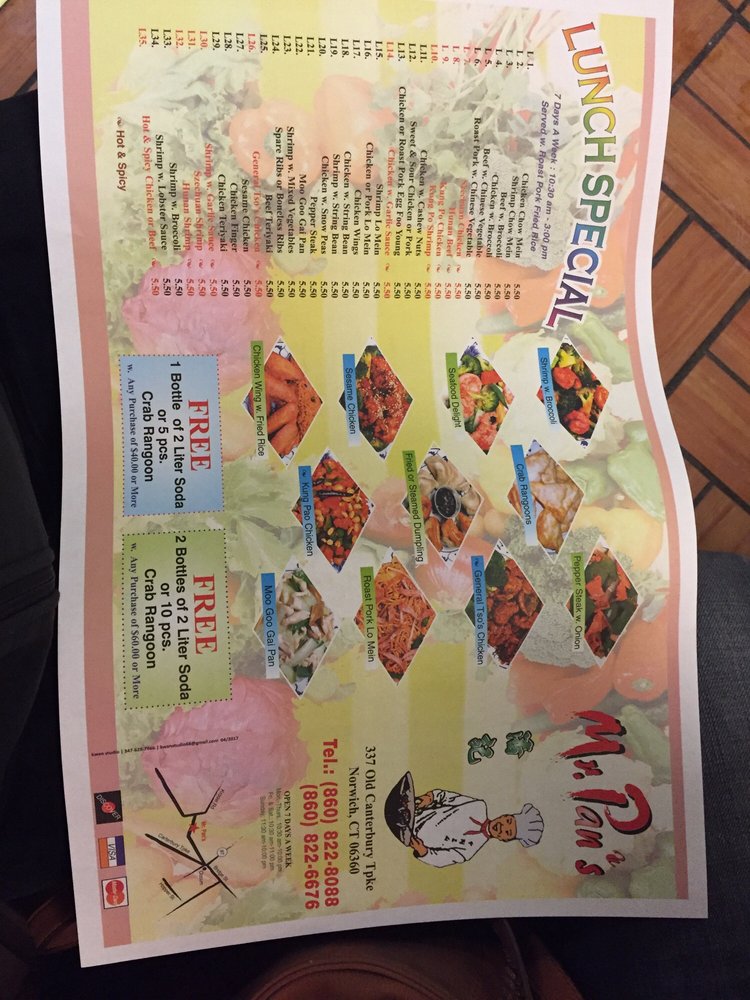 Introducing Mr Pan's, a Chinese restaurant located in Norwich, CT, known for its delicious food and friendly service. With a focus on takeout, Mr Pan's offers a variety of traditional Chinese dishes such as General Tso's chicken, orange chicken, lo mein, and dumplings. Customers rave about the quality and consistency of the food, mentioning favorites like the Pure Tea with Milk Cap, Fruit Tea, and Fruit Tea with Milk Cap options. Despite limited seating, the restaurant's small footprint doesn't take away from the big flavors found in their dishes. While some customers note recent price increases, the overall consensus is that Mr Pan's is a top choice for Chinese takeout in the area. Whether you're a longtime fan or a first-time visitor, Mr Pan's promises a satisfying dining experience with every order.